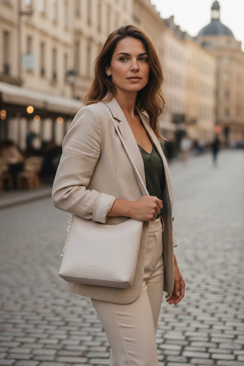 • Gold Detaylar: Sap bağlantılarındaki ve ön yüzdeki gold rengi metal aksesuarlar, beyazın soft tonuyla mükemmel bir uyum yakalar.